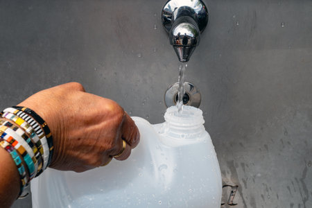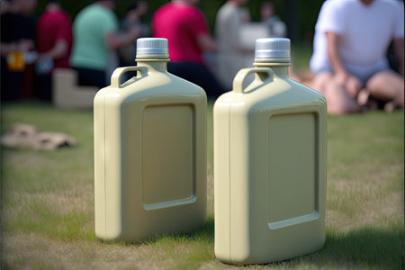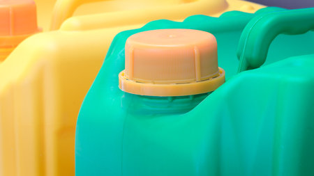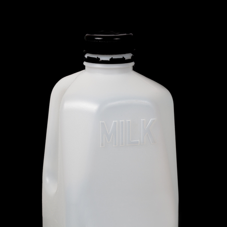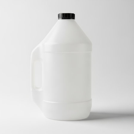 A close-up shot focuses on the handle and cap of a white plastic jug, with a softly blurred colorful background.