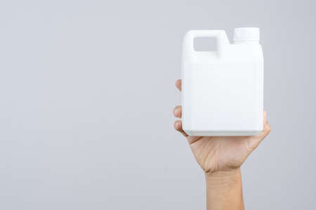 Hand holding 1000 cc, a liter plastic bottle or 0.26 gallon capacity for containing fertilizer or industrial liquid on white background