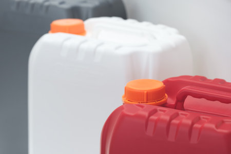 Three plastic containers: white, red and black, lined up next to each other, industrial packaging concept background.