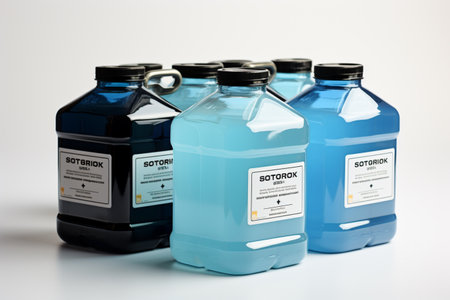 some blue plastic jerrycans, with red caps, arranged in different lines on a pale brown or pale green background