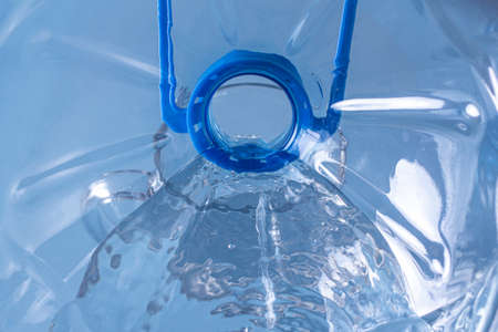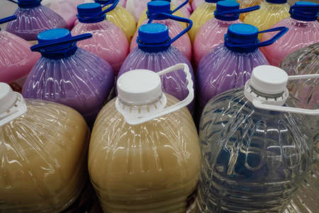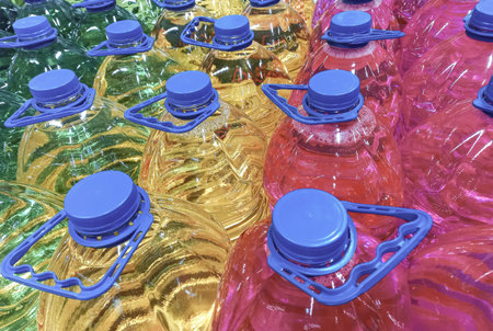 Plastic transparent bottles with liquid of different colors. Сontainers and packaging made of plastic and polyethylene. Recycling and reuse of plastic waste