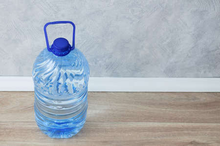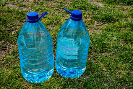 Large water bottle on grass in garden .Water bottle on green grass with copy space. plastic bottle with water on a background of green grass.
