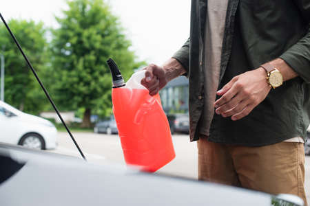 Man holding canister with blue liquid near brick wall, closeup. Space for text