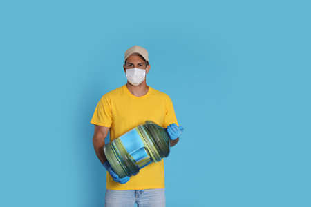 Courier in medical mask holding bottle for water cooler on light blue background. Delivery during coronavirus quarantine
