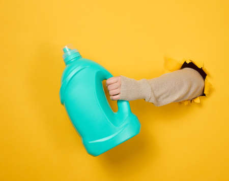 blue plastic bottle with liquid detergent in a female hand on a yellow background. A part of the body sticks out of a torn hole in the background