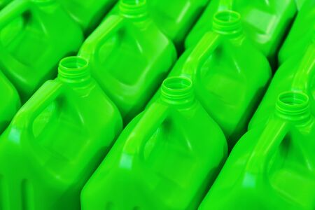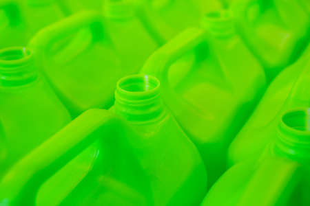 Many empty green plastic jerrycans background in warehouse, market, factory or exhibition - close up