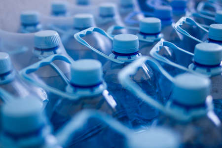 Many blue plastic bottles with blue caps with mineral water in a supermarket. Close Up. Main subject of a focus
