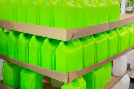 plastic cans of light green color in the warehouse, production, factory. Background from plastic canisters
