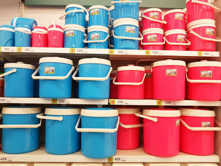 CHIANG RAI, THAILAND - FEBRUARY 15 : various brand of plastic ice bucket in packaging for sale on supermarket stand or shelf on February 15, 2017 in Chiang rai, Thailand.