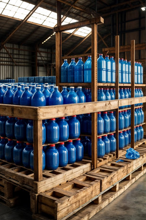 Plastic bottles with chemical liquid stored in wooden boxes on industry interior warehouse. Storage cans in factory storage of liquids. Industrial warehousing and storage concept. Copy ad text space