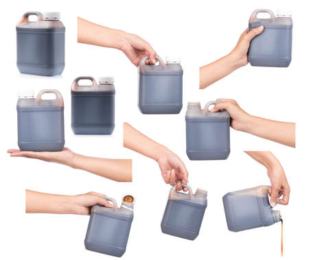 Collection of Engine oil pouring from bottle in hand isolated on white background.