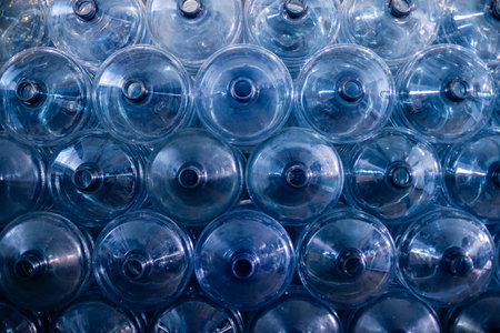 background of plastic bottles, preparation for washing and processing plastic, a water production plant, drinking purified water, many plastic bottles are stacked in a row