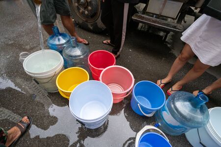Empty water buckets waiting for fresh water from emergency mobile tank truck