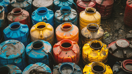 Close up of old used oil cans in a factory