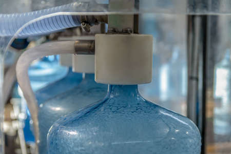 Plastic bottle or tank for drinking water in production line of factory. Process of filling water into plastic bottles to bring out to consumers. gallon drink water manufacturing.