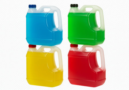 Red, yellow and blue plastic containers for chemicals.