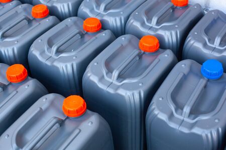 Many plastic jerricans with blue liquid