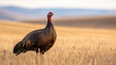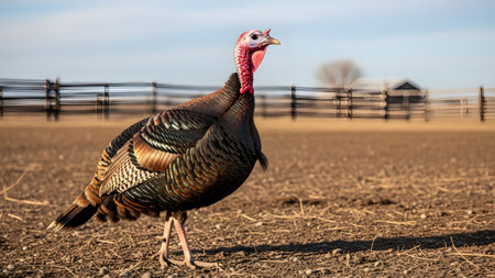 Majestic turkey strolling in cornfield post harvest, a captivating and picturesque scene