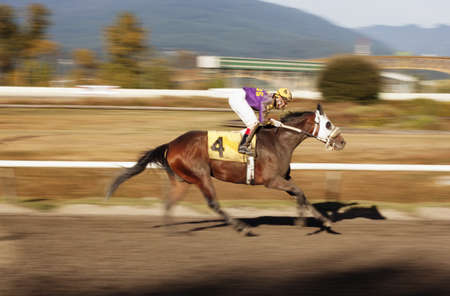 A jockey rushes to the finish line on his horse during a race. A traditional European sport.