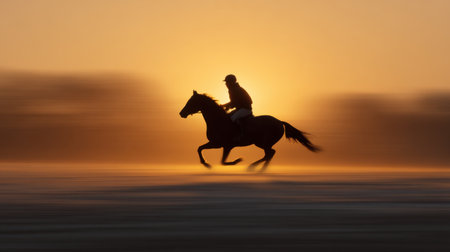 A stunning silhouette of a horse and rider galloping into the sunrise, capturing the essence of freedom and movement with a dreamy backdrop of soft light.