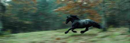 A majestic black horse runs swiftly across a lush, green meadow surrounded by dense autumn foliage, capturing the essence of freedom and strength.