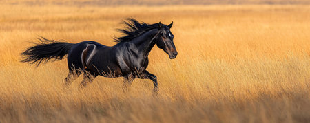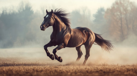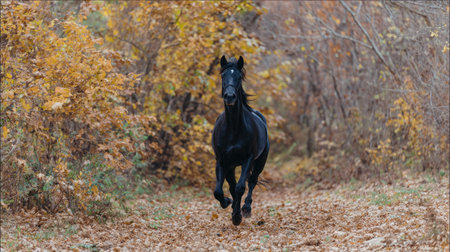A dark horse runs through a woodland setting with fall foliage. The scene features a naturalistic composition with warm colors. This image is well-suited for diverse commercial purposes, including use in advertising, editorial content, and various design projects. It showcases outdoor beauty and animal subjects.