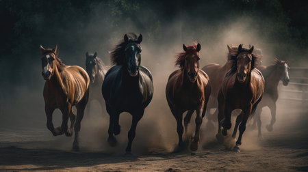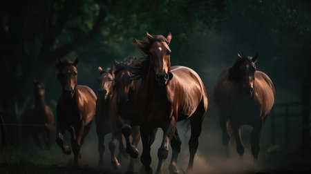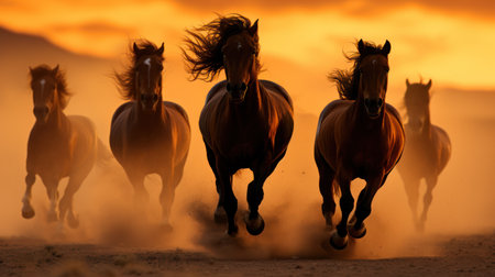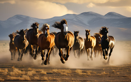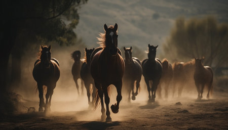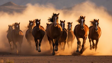 A herd of horses charges forward in a dynamic composition. Warm hues of sunlight filter through the dust, highlighting the animals' muscular forms and manes. This image showcases a natural environment with a sense of movement. Ideal for commercial applications related to wildlife and nature.