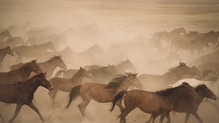 A herd of horses charges through a dusty landscape, creating a dynamic visual effect. The image features a warm color palette with browns and tans dominating. The composition emphasizes movement and action with a wide-angle perspective and natural lighting, suitable for various editorial and commercial applications.