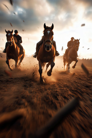 Powerful horses race toward the finish line in an intense, colorful scene full of energy and competitive spirit.