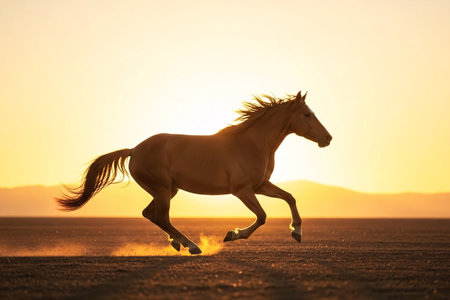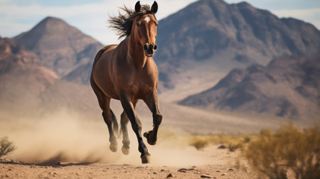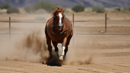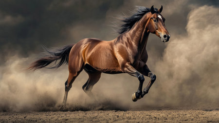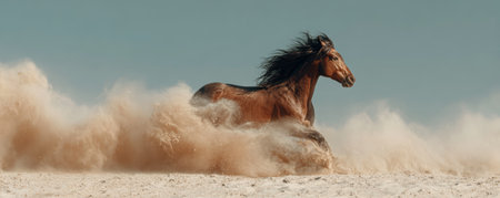 Brown horse running fast on sandy desert with dust flying, powerful animal in motion under clear sky, wild energy and freedom