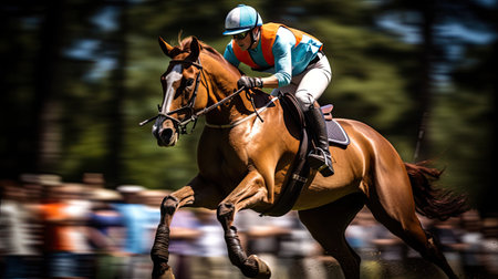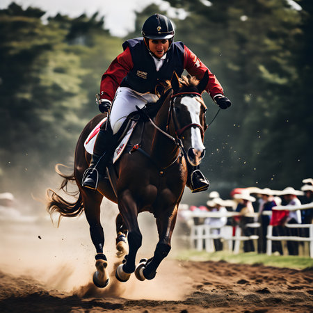 Rider approaches cross-country jump with determination vivid course colors intense concentration competitive spirit