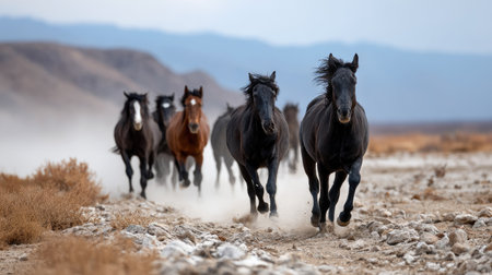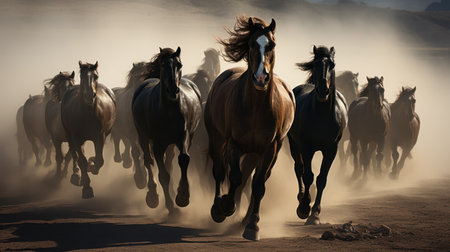 A dynamic scene of majestic horses galloping across a dusty landscape, showcasing their natural beauty and freedom in an expansive wilderness setting.