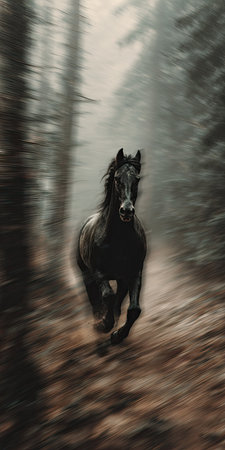 A dark horse runs forward through a wooded area captured with motion blur. The image presents a dark and moody atmosphere. The composition emphasizes the animal's movement, surrounded by blurred trees and foliage. Potential uses include editorial illustrations, or imagery representing freedom.