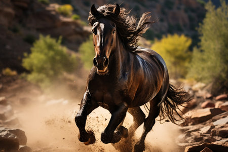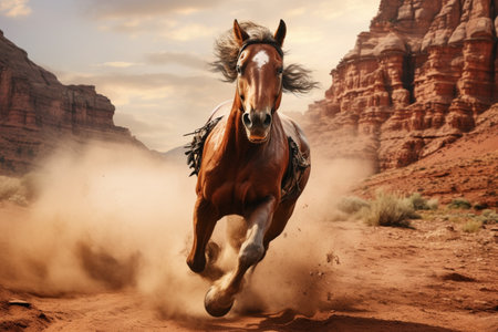 Horse charging through an old western-inspired landscape. A high quality image making by generative ai.