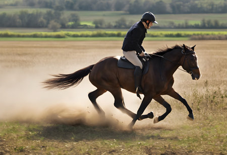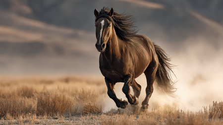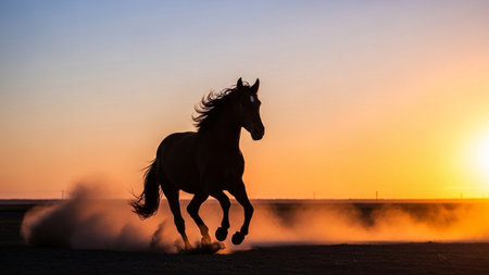 A magnificent horse gallops through a dusty landscape, kicking up clouds of dust against a beautiful sunset backdrop. The scene captures freedom and wild beauty.
