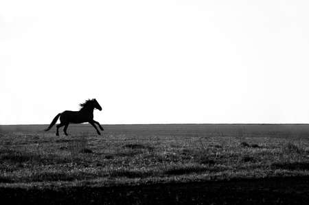 Solitary Horse Running through the Field Among the Hills in the Early Morning