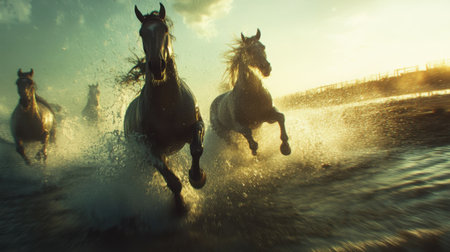 Epic shot of galloping horses kicking up spray through a river, Akhal-Teke shining in front, wide angle, blurred background for stunning motion