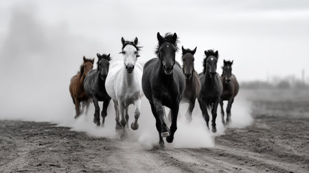 A striking scene captures a herd of horses galloping through a dusty landscape, enveloped in a mysterious fog, showcasing their beauty and power.