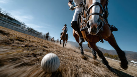 Experience the thrill of a dynamic polo match featuring fast-moving horses and skilled riders. Capture the excitement of this outdoor sport on a sunny day.