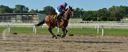 Madrid, Spain- March 21, 2021: Photo with speed effect of a racehorse at the La Zarzuela racecourse in Madrid. Horse races. Horse racing. Jokey on racehorse