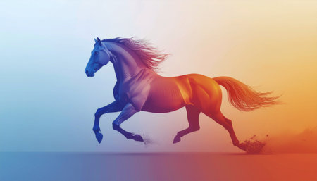 A powerful horse in mid-gallop, transitioning from cool blue to warm orange hues, symbolizing energy and movement.