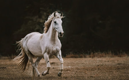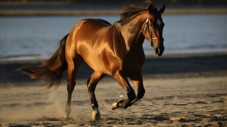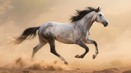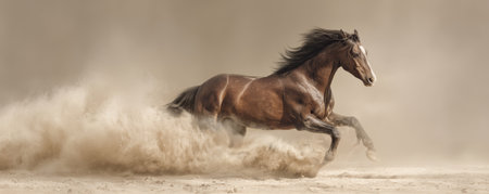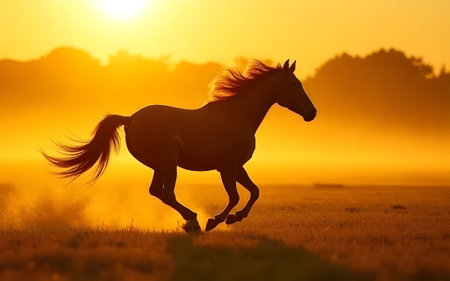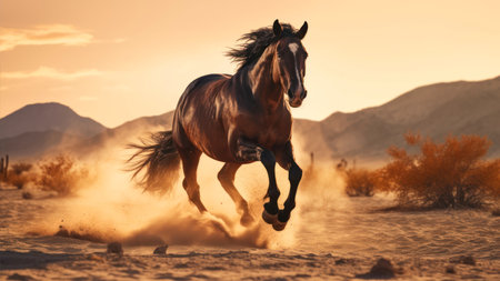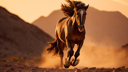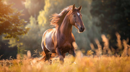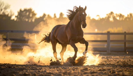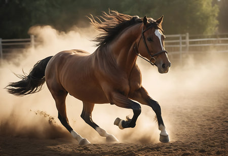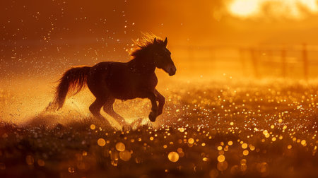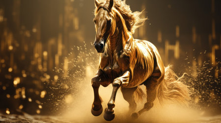 A powerful horse gallops through a scene of golden light and dust. The image presents a dynamic composition with a blurred background. Warm tones and textures emphasize the animal's movement and strength, suitable for commercial projects promoting themes of freedom, energy, and wildlife.