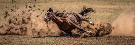 A powerful horse skids on its hooves, sending dust flying as it takes a sharp turn in an open field under the afternoon sun.