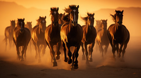A herd of horses gallops across a dusty landscape, bathed in the warm glow of a setting sun. The image features a shallow depth of field, soft textures, and vibrant colors. It could be suitable for a variety of editorial or commercial projects.