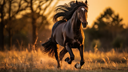 A striking black horse is captured mid-gallop in this image, its flowing mane and tail accentuated by the wind. The scene is bathed in soft sunlight, creating a warm, golden atmosphere. The image showcases a natural, outdoor environment with blurred background details suggesting a vast field. Suitable for various editorial and commercial applications.