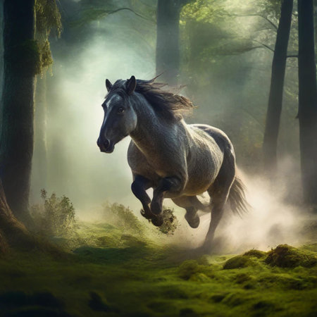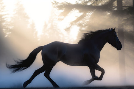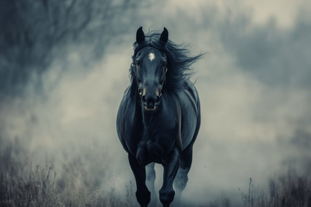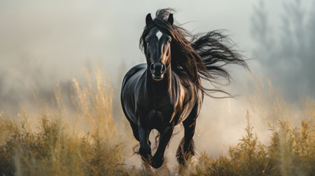 A strong black horse gallops through a thick mist, showing its powerful build and mane flowing in the wind. The surrounding environment is shrouded in mystery, creating a captivating moment.