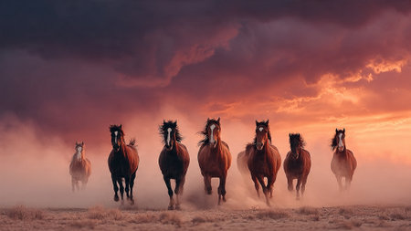As the sun dips below the horizon, a majestic herd of horses charges forward with unstoppable force. This image captures a moment of pure, wild spirit, symbolizing freedom, teamwork, and the raw power of nature in motion.