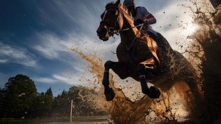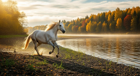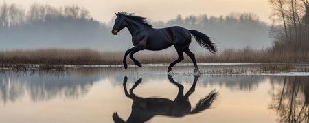 Horse running through water at dawn, serene landscape. Nature and freedom concept