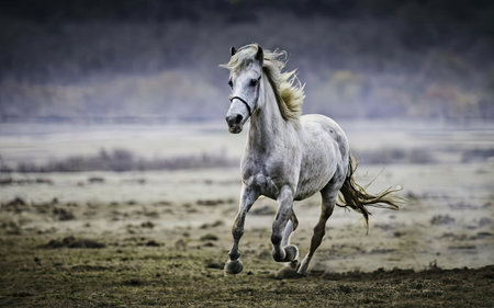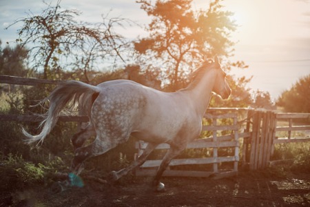 White horse gallops in the field. Beautiful white horse gallops in the field.