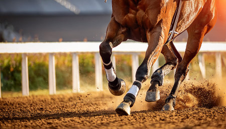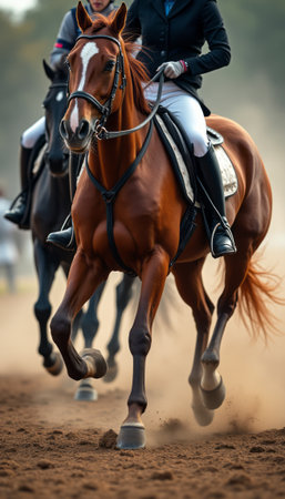 Fast horses galloping during a race with motion blur, emphasizing speed, power, competition, and equestrian sport.